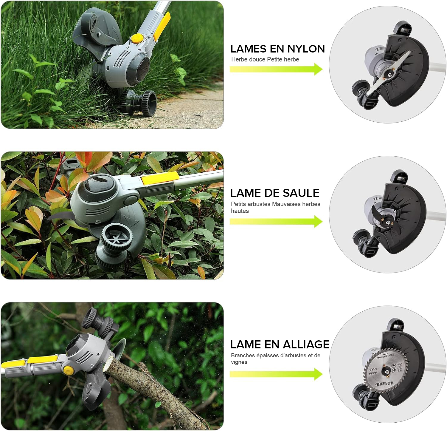 Débroussailleuse sans fil, coupe-brosse électrique et taille-bordure trois en un, comprend 1 x clé à écrou, 1 x tournevis à double usage, 1 x butée d'herbe, 1 x lunettes de protection, batteries 4,0 Ah et chargeur, 5 x lames en plastique, 2 x lancettes en acier, 2 x lames de scie circulaire, 10 x lames en nylon à double tresse (plus faciles à changer), 20 x fils de coupe, 1 x débroussailleuse sans fil et tête pivotante à 90° et poignée télescopique, roues latérales et glissière auxiliaire avec affichage numérique de puissance.