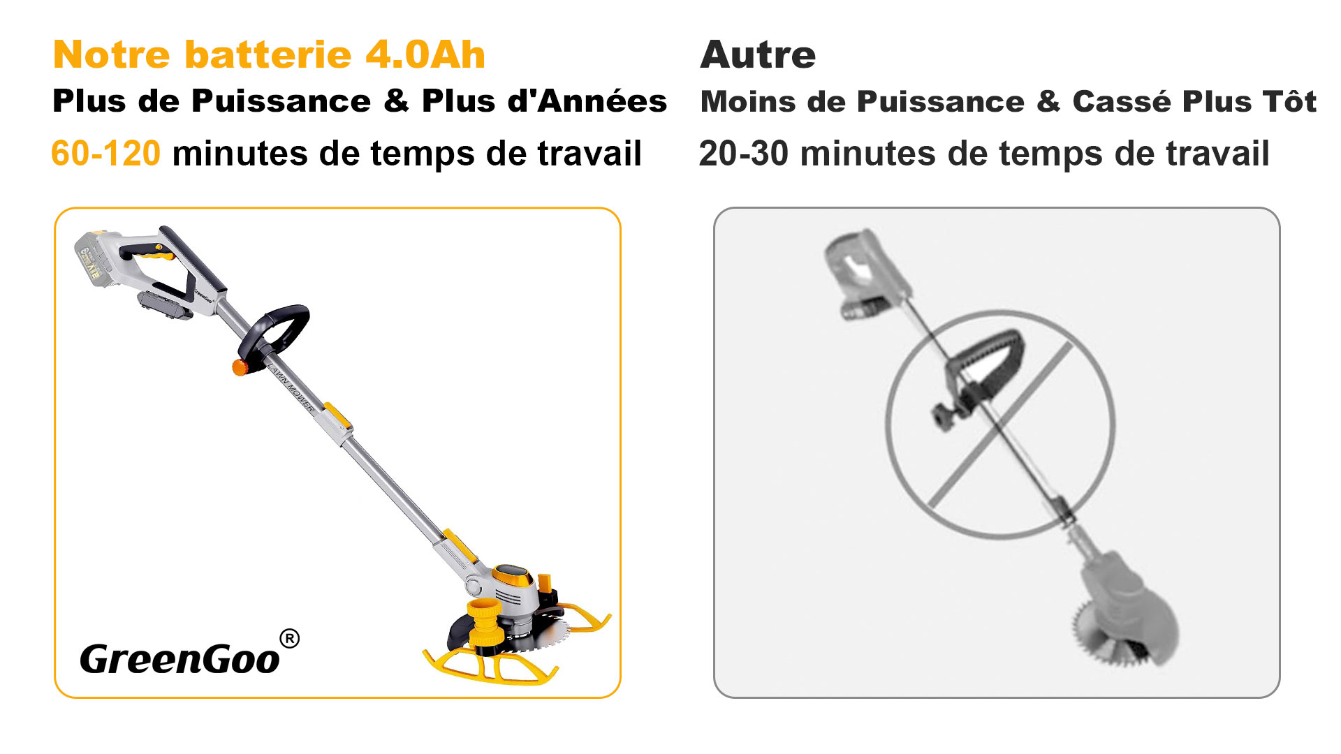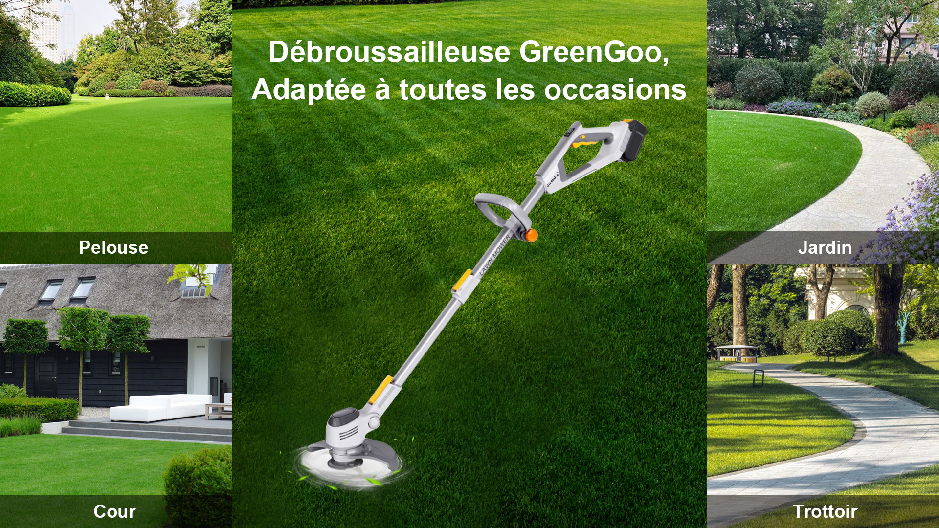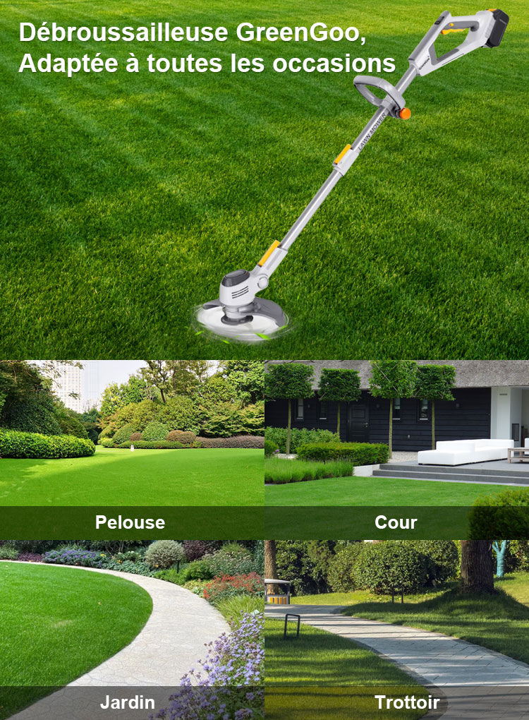 Que ce soit sur des pelouses plates, des terrains en pente ou autour d'obstacles, GreenGoo offre de la flexibilité. Elle peut naviguer efficacement dans les coins et les bords serrés, grâce à leur maniabilité. Sur un terrain vallonné ou inégal, leurs réglages de hauteur ajustables aident à maintenir une coupe uniforme. Dans l'ensemble, les débroussailleuses GreenGoo sont conçues pour une utilisation multi-angle, garantissant une pelouse bien entretenue, quelles que soient les contours et les défis du paysage.